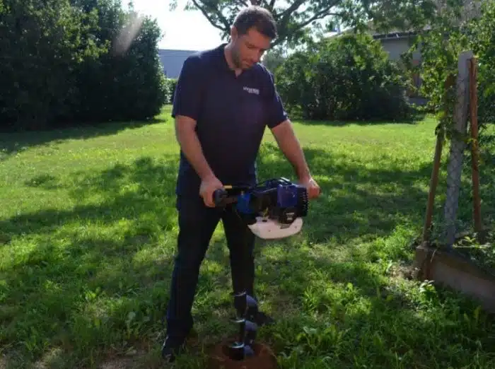 La tarière sur roue qui possède une roue de stabilisation. Il suffira d’un seul opérateur pour la contrôler facilement. L’avantage d’utiliser la tarière sur roue est que la roue absorbe le couple de rotation et évite tout effort inutile et bien sûr tous les à-coups dans les bras de celui qui en fait usage.